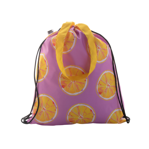 Custom made tas met trekkoordsluiting met gekleurde touwtjes en lange hengsels, 190T RPET polyester. Ook te gebruiken als boodschappentas. Met all-over sublimatiebedukking en onderscheidend RPET-label. MOQ: 25 stuks.