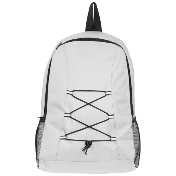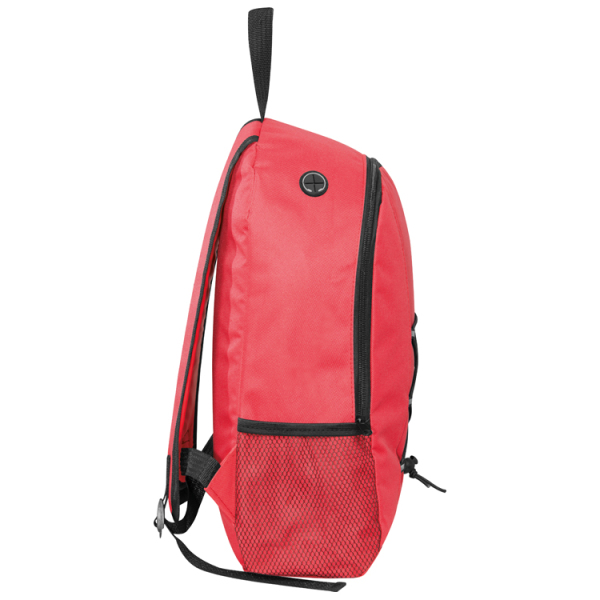 Rugzak van 600D Polyester met ophanglus, twee draagnetjes aan weerszijden, doorvoer voor koptelefoon en twee gevoerde schouderbanden. Uw reclame wordt op de voorzijde gedrukt.