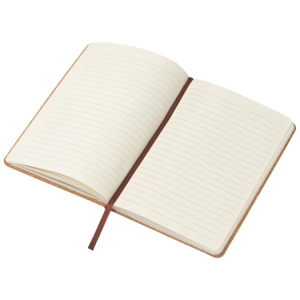 Notitieboekje van kurk, A5 met 160 gelinieerde paginas, leesbandje en een elastiek om het boekje te sluiten. Uw reclame wordt op de voorzijde gedrukt
