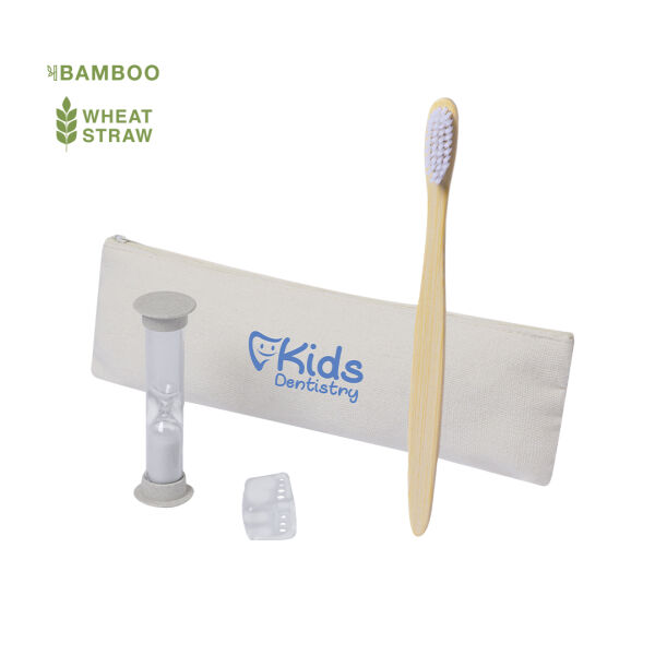 Tandenborstel- en zandloperset van bamboe en tarwestro. Inclusief tandenborstel met ergonomisch handvat van zacht bamboe, met beschermkap. Ook inclusief een 2 minuten zandloper van tarwestro. Gepresenteerd in een handig etui van ademend katoen.